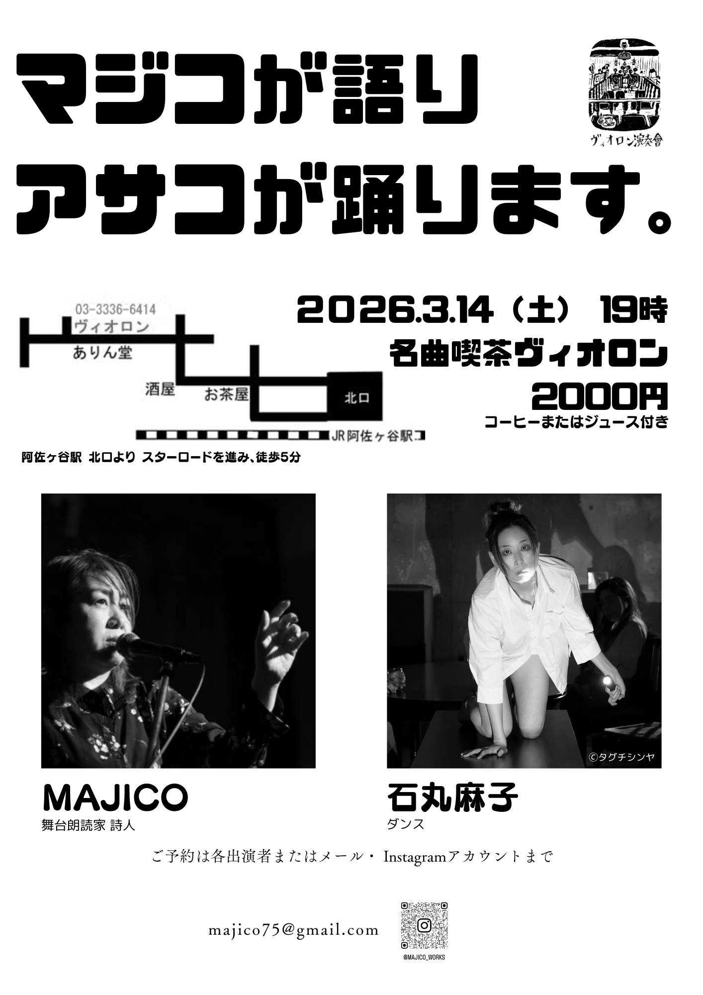 MAJICOが語り、アサコが踊ります。 公演情報 2026.03.14 2026年3月14日(土)19時名曲喫茶ヴィオロン2000円(コーヒーまたはジュース付き)出演:MAJICO(舞台朗読家 詩人) 石丸麻子(ダンス)